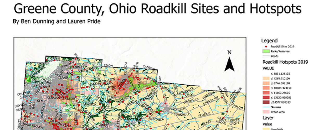 Two Cedarville University students earned the People’s Choice Award for their global information system (GIS) map showing Ohio wild animal-vehicle collision sites and hotspots.